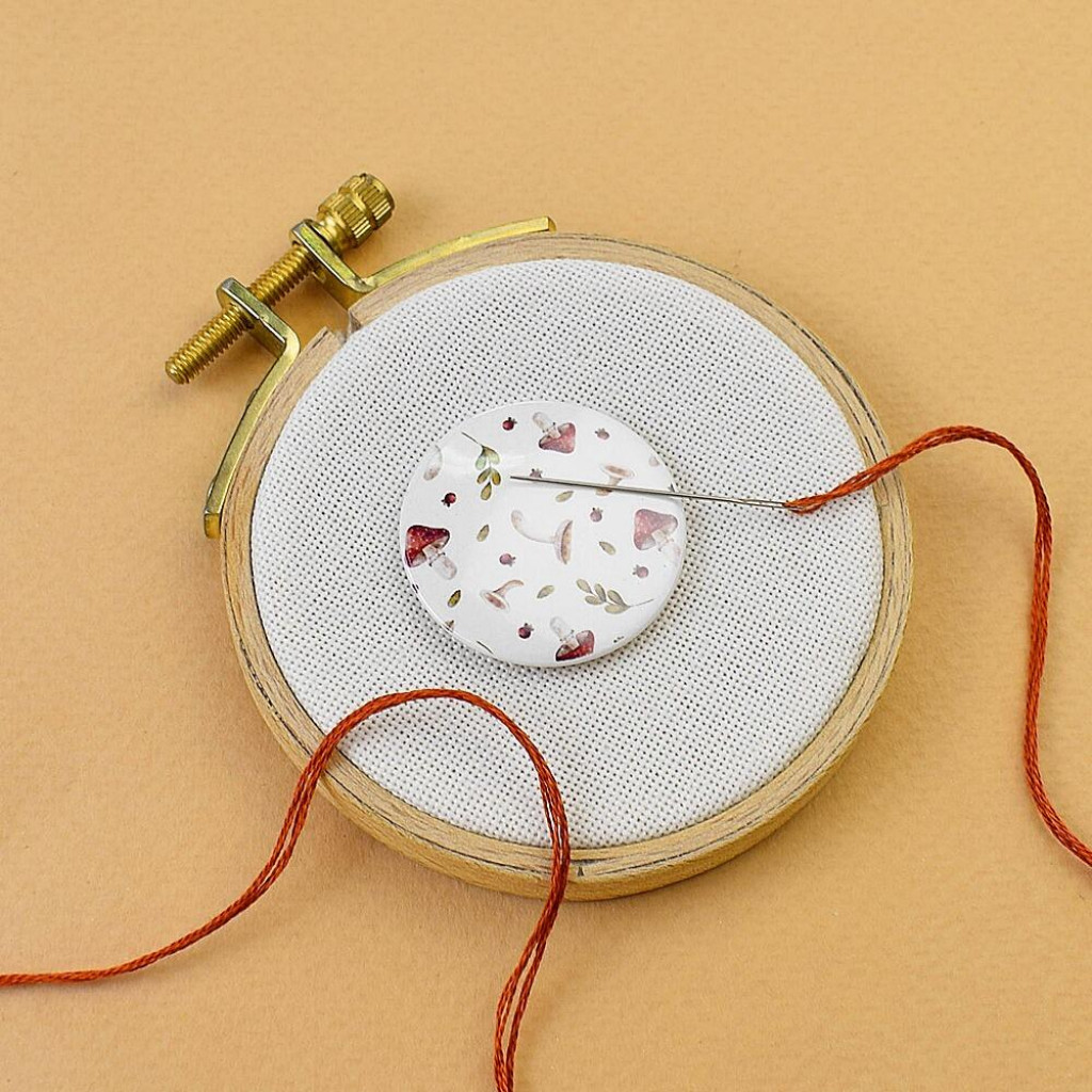Тримач складається з двох частин із потужними неодимовими магнітами. Один елемент із зображенням розміщується на лицьовій стороні тканини, інший — на звороті. Магніти надійно фіксують виріб, дозволяючи зручно закріплювати голки, схеми та інші металеві дрібниці під час роботи.