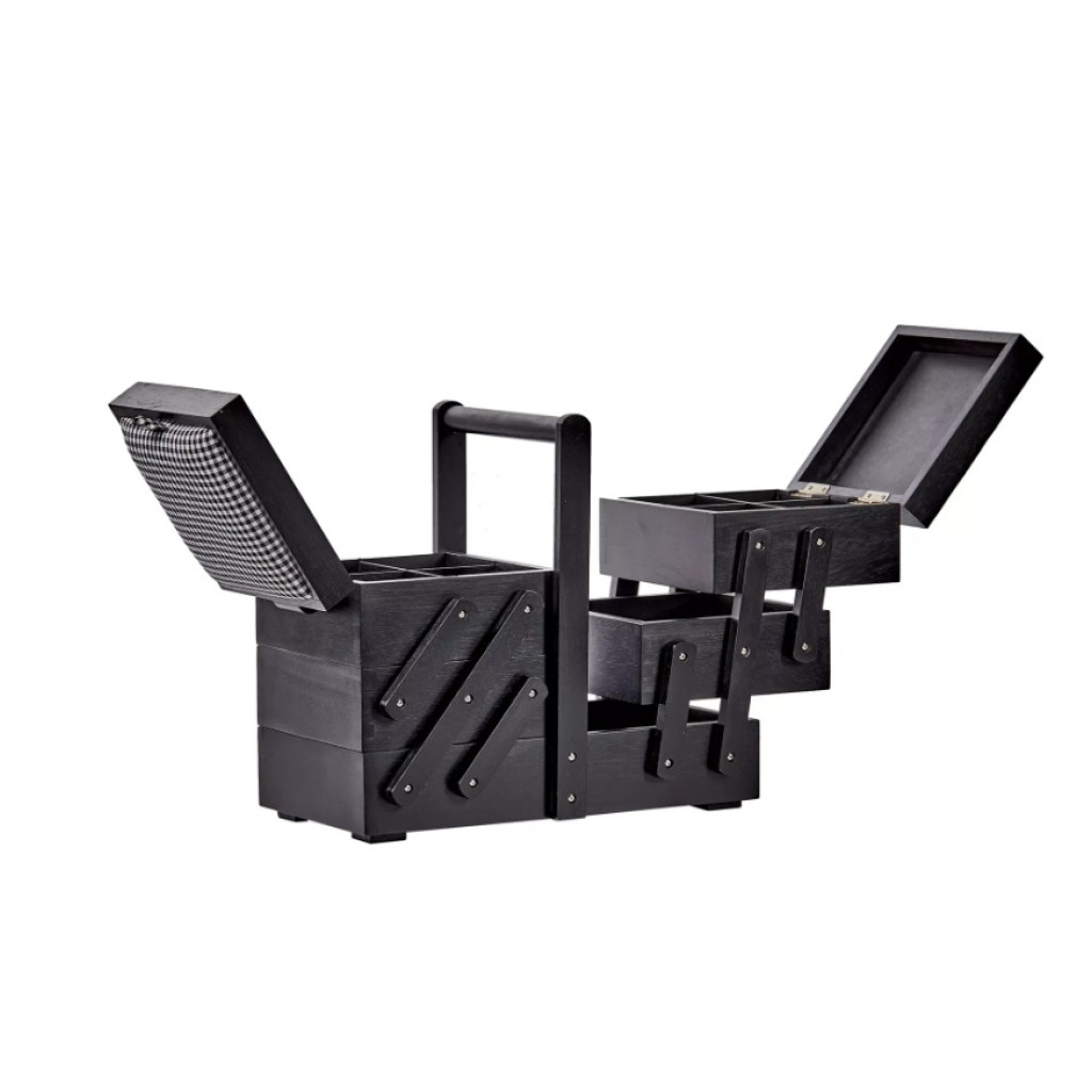 Конструкція з декількома рівнями зберігання дозволяє зручно розмістити нитки, ножиці, голки, сантиметрову стрічку, маркери, шпильки та інші дрібниці для рукоділля. Верхні секції відкриваються за принципом розсувної системи, забезпечуючи швидкий доступ до вмісту, а м’які текстильні вставки на кришці можуть використовуватися як зручна поверхня для шпильок або голок.
