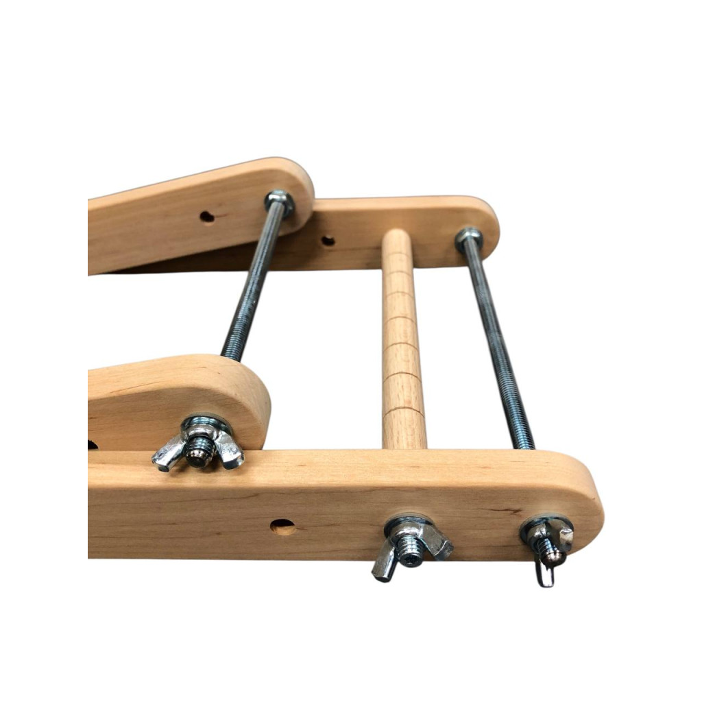 Верстати виготовлені з масиву дерева, якісно відшліфовано та приємні на дотик. Горизонтальні дерев'яні планки круглі, з насічками. Верстат має додаткові отвори для зручності розташування частин станка на три відстані, що підійдуть під особливо вимогу майстрині. Тип кріплення ниток - пази або біндером.