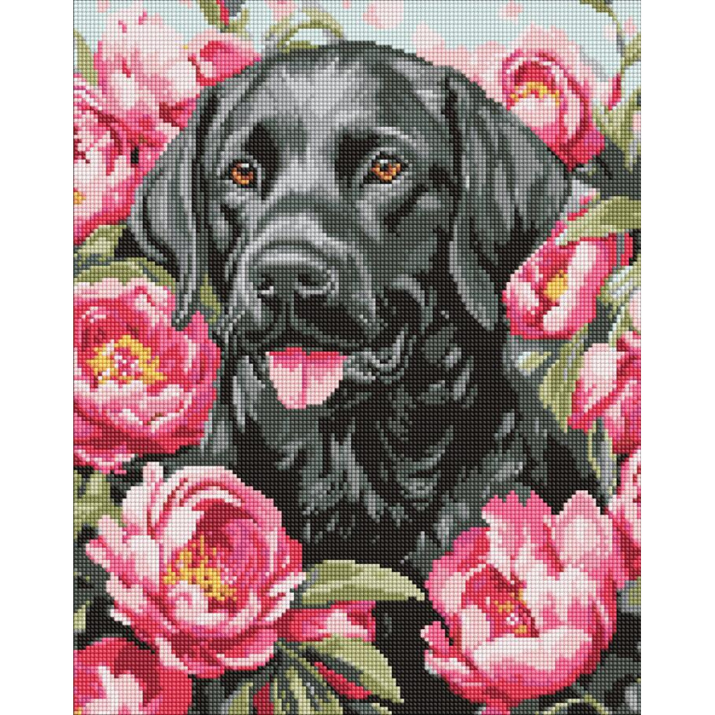 AMO20084 Ideyka Алмазна мозаїка - Собака у півоніях 40х50 см (круглі, на підрамнику, АМО-20084) ©art_selena_ua