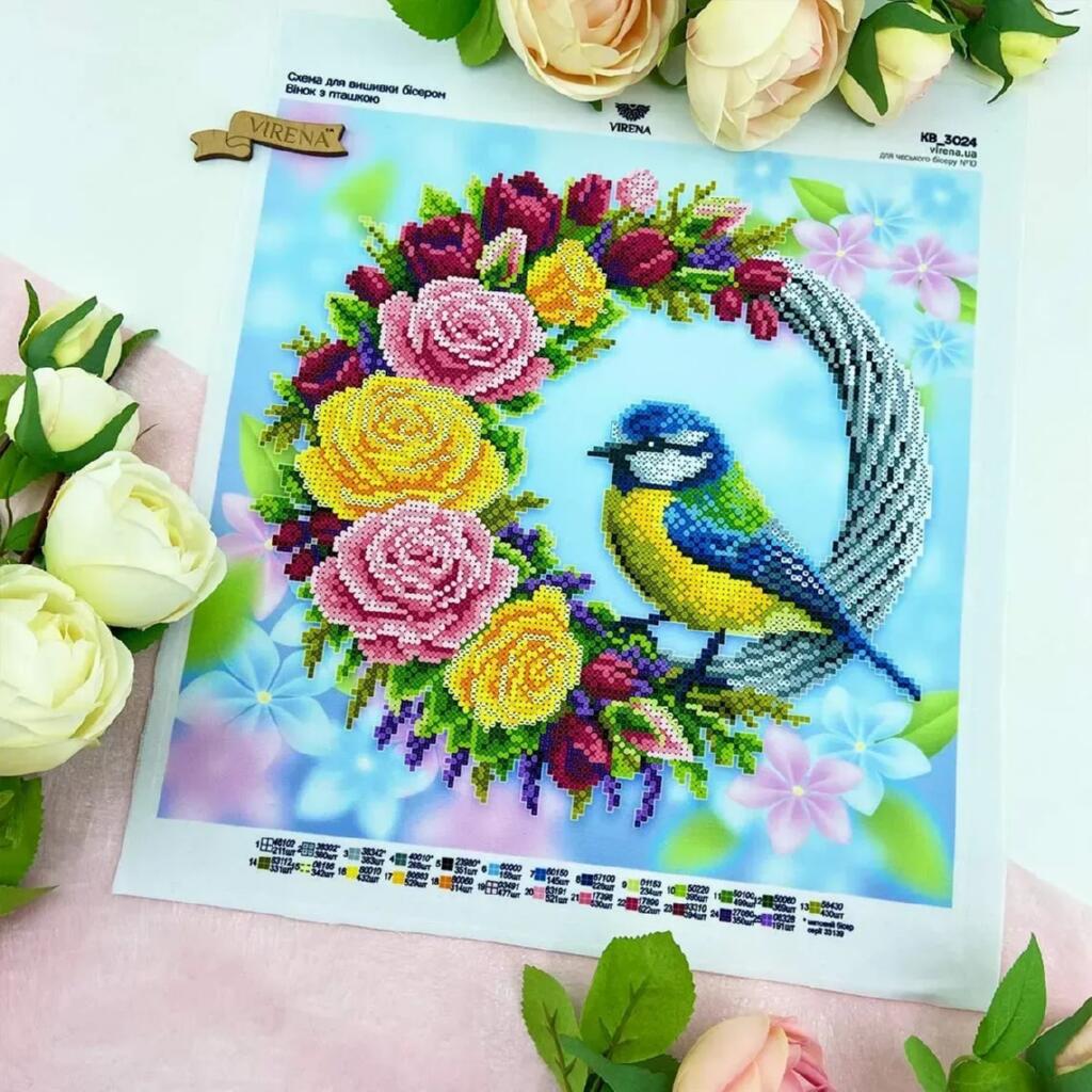 КВ_3024 Virena Заготовка для вишивки бісером - Вінок з пташкою 29,5x29,5см (габардин)