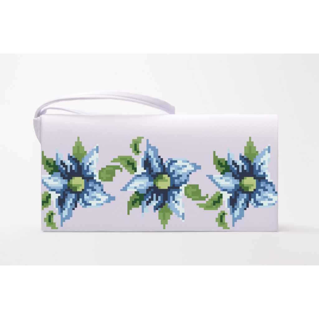 Заготовка для вишивки клатча Сині квіти призначена для часткової зашивки бісером або нитками. Схема надрукована на батисті білого кольору екологічно чистими стійкими фарбами, що не змиваються після прання. Деталі клатча підготовлені з урахуванням зручності вишивання та акуратного фінального складання виробу.