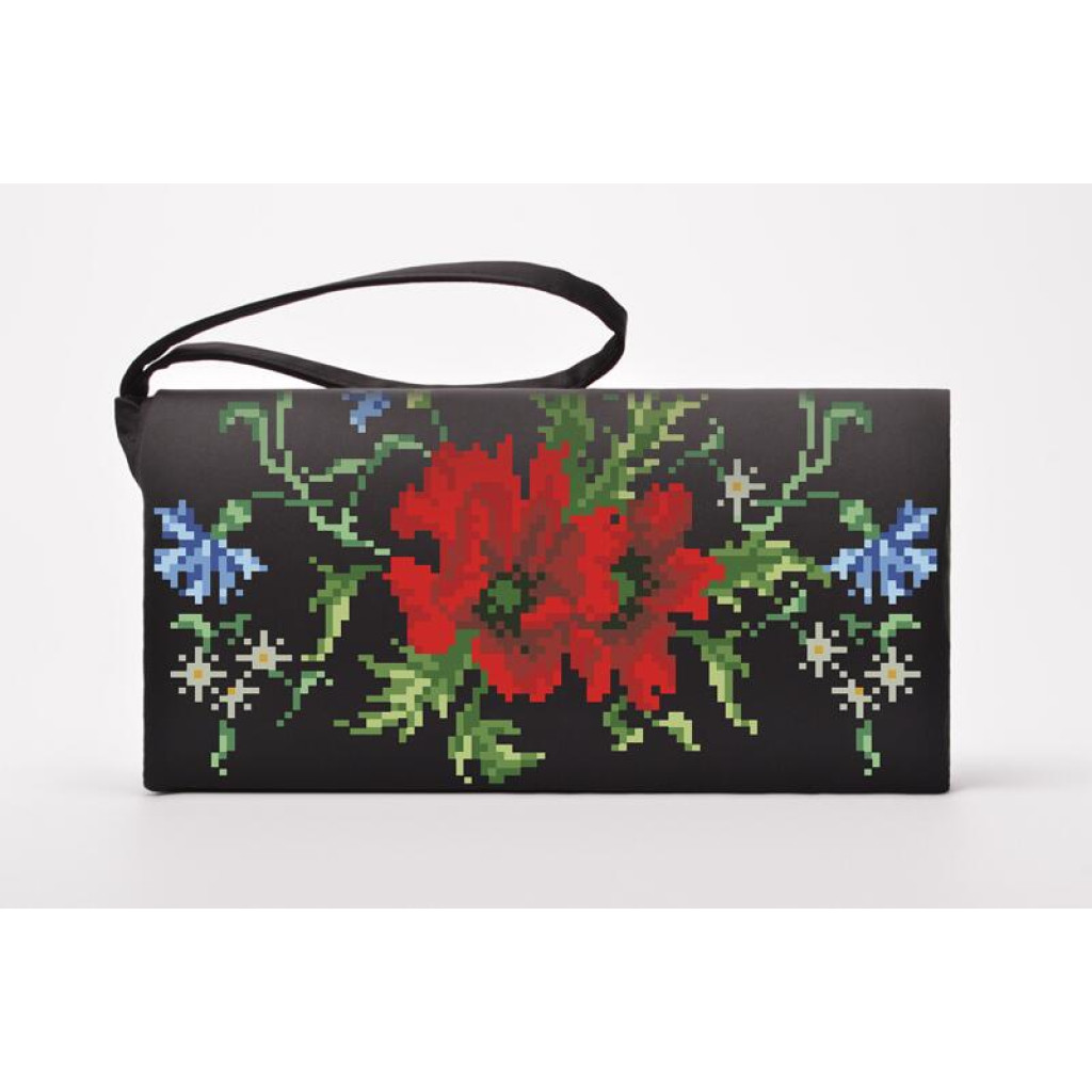 Заготовка для вишивки клатча Ніжні маки, волошки, колоски призначена для часткової зашивки бісером або нитками. Схема надрукована на батисті чорного кольору екологічно чистими стійкими фарбами, що не змиваються після прання. Деталі клатча підготовлені з урахуванням зручності вишивання та акуратного фінального складання виробу.