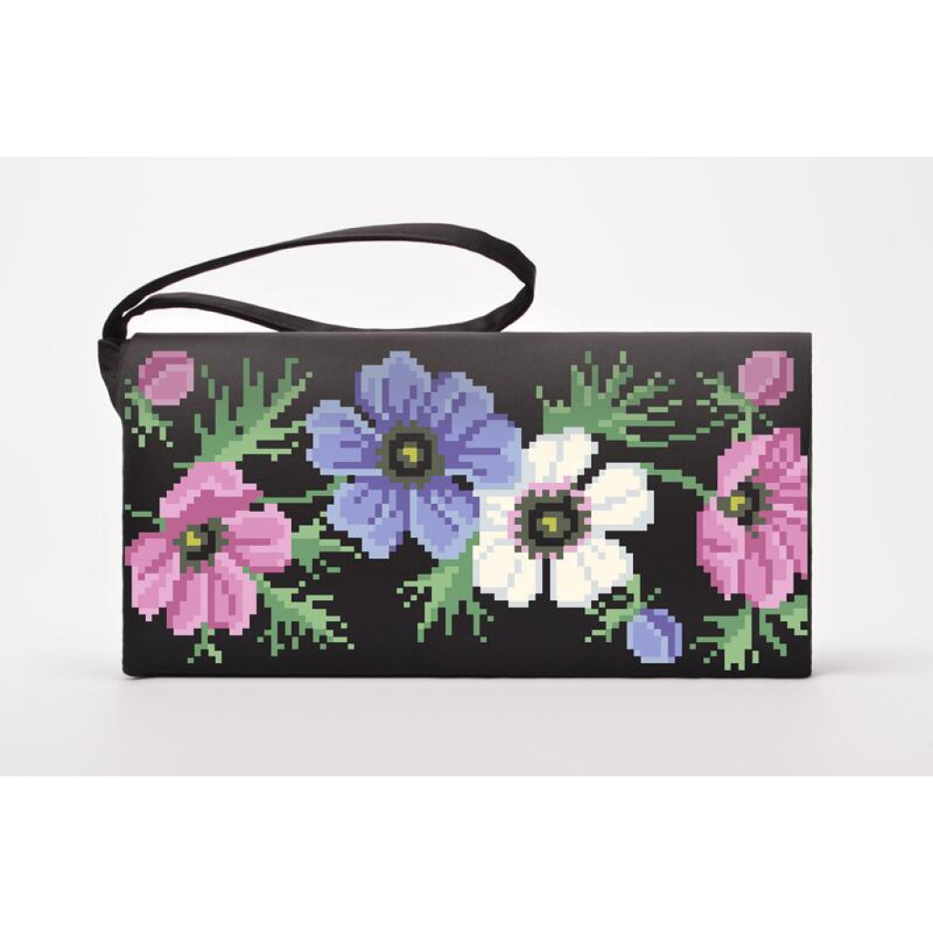 Заготовка для вишивки клатча Анемони призначена для часткової зашивки бісером або нитками. Схема надрукована на шовковій тканині чорного кольору екологічно чистими стійкими фарбами, що не змиваються після прання. Деталі підготовлені з урахуванням зручності вишивання та акуратного фінального складання виробу.