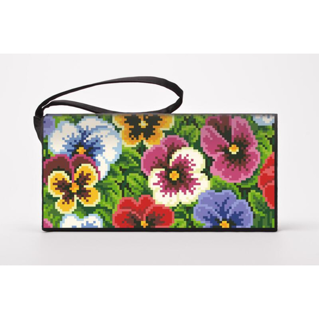 Заготовка для вишивки клатча Мальовничі братки призначена для часткової зашивки бісером або нитками. Схема надрукована на шовковій тканині чорного кольору екологічно чистими стійкими фарбами, що не змиваються після прання. Деталі підготовлені з урахуванням зручності вишивання та акуратного фінального складання виробу.