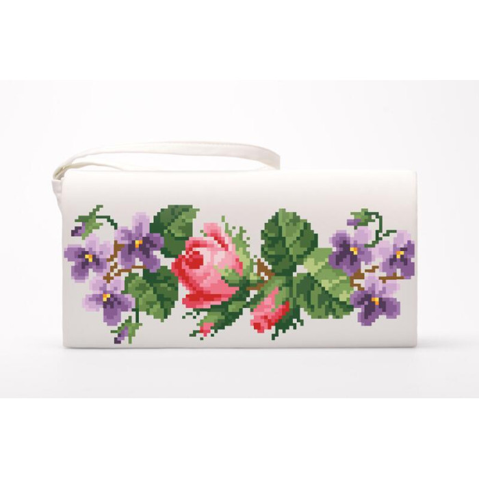 КЛ022шБ1301 Барвиста вишиванка Заготовка для вишивки - Клатч Троянди і фіалки 21x13 см шовк, білий