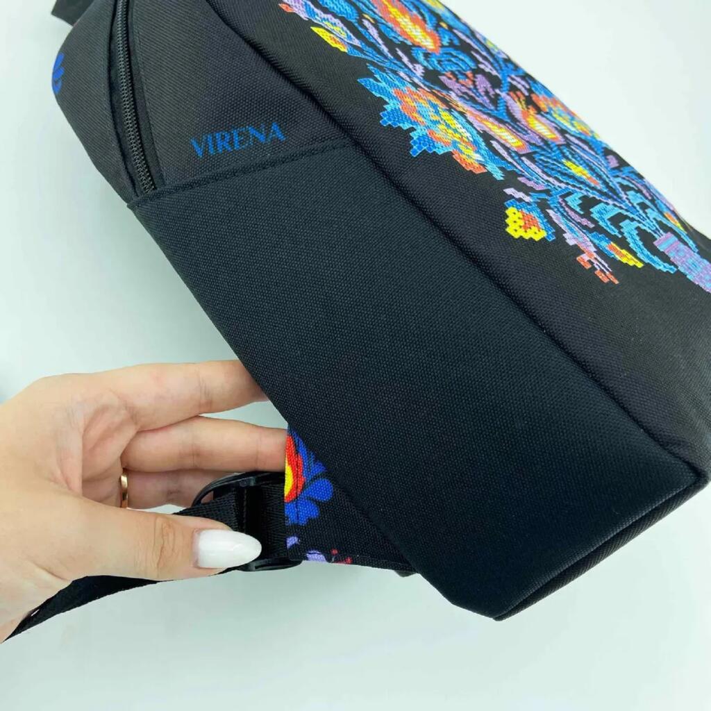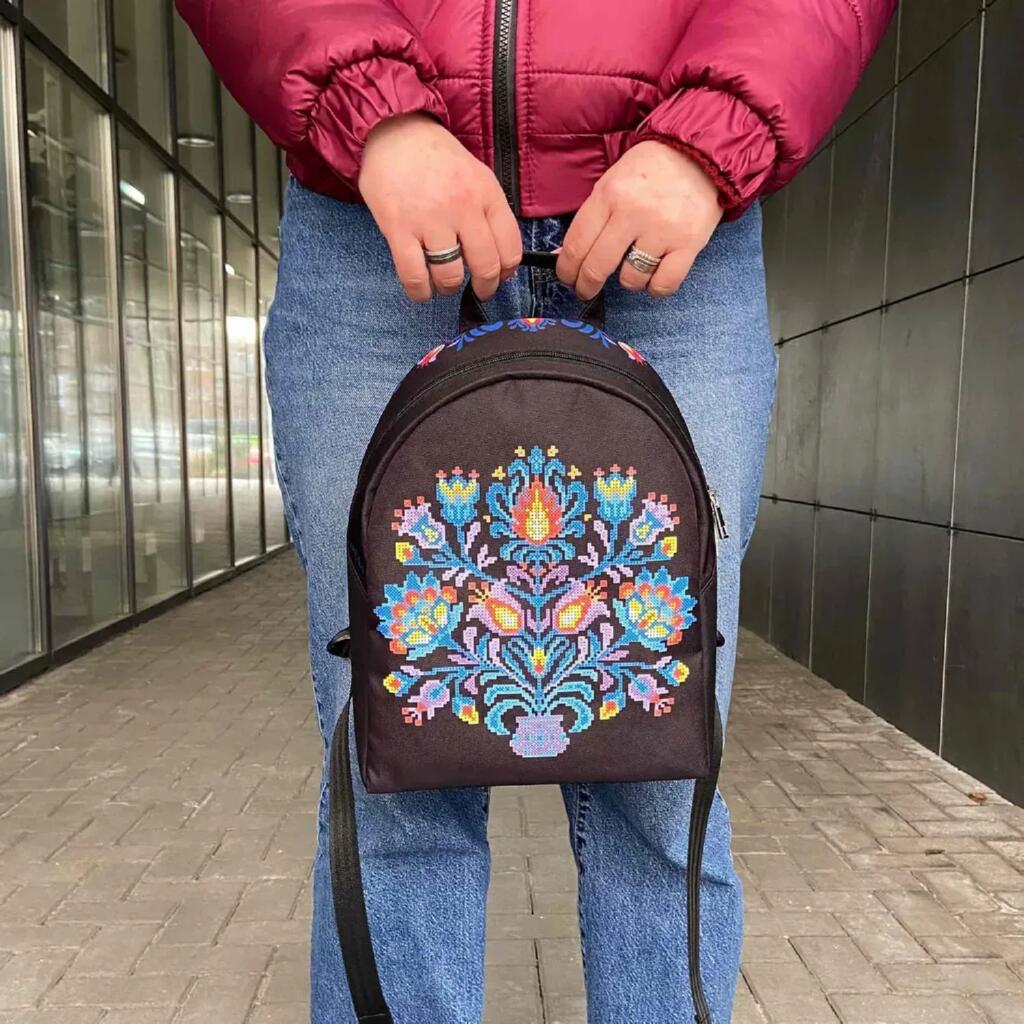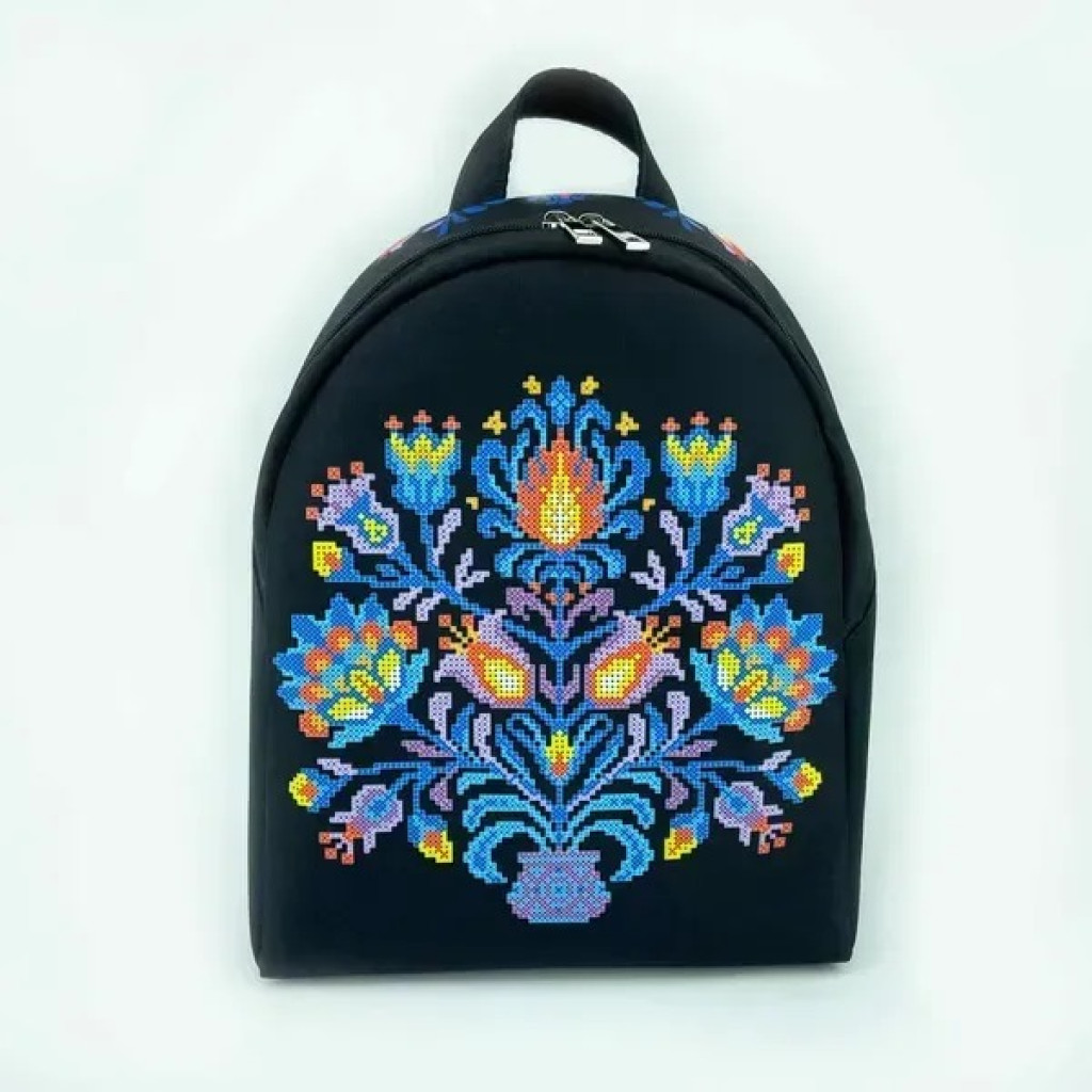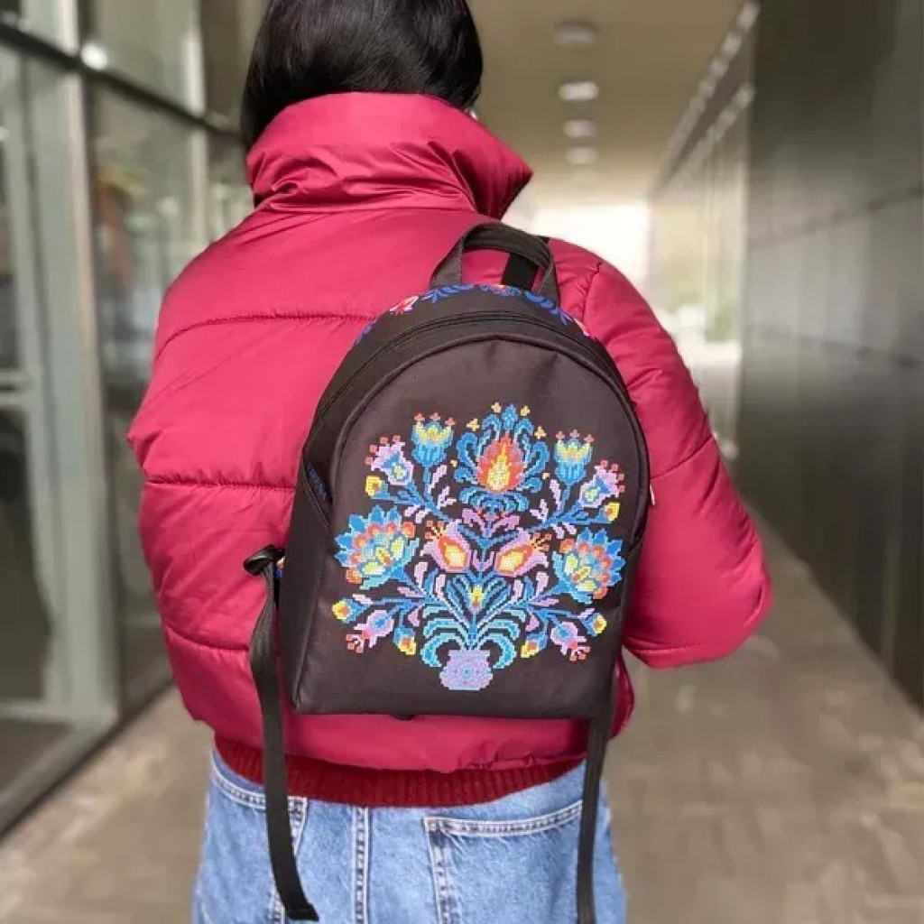 Декор на основі яскравий, чіткий і стійкий до вологи та сонячного світла. Верхній замок має два бігунки для зручного відкривання, а лямки можна регулювати під комфортну довжину. Вишивка розміщується на лицьовій частині виробу та виконується легко завдяки продуманій конструкції рюкзака.