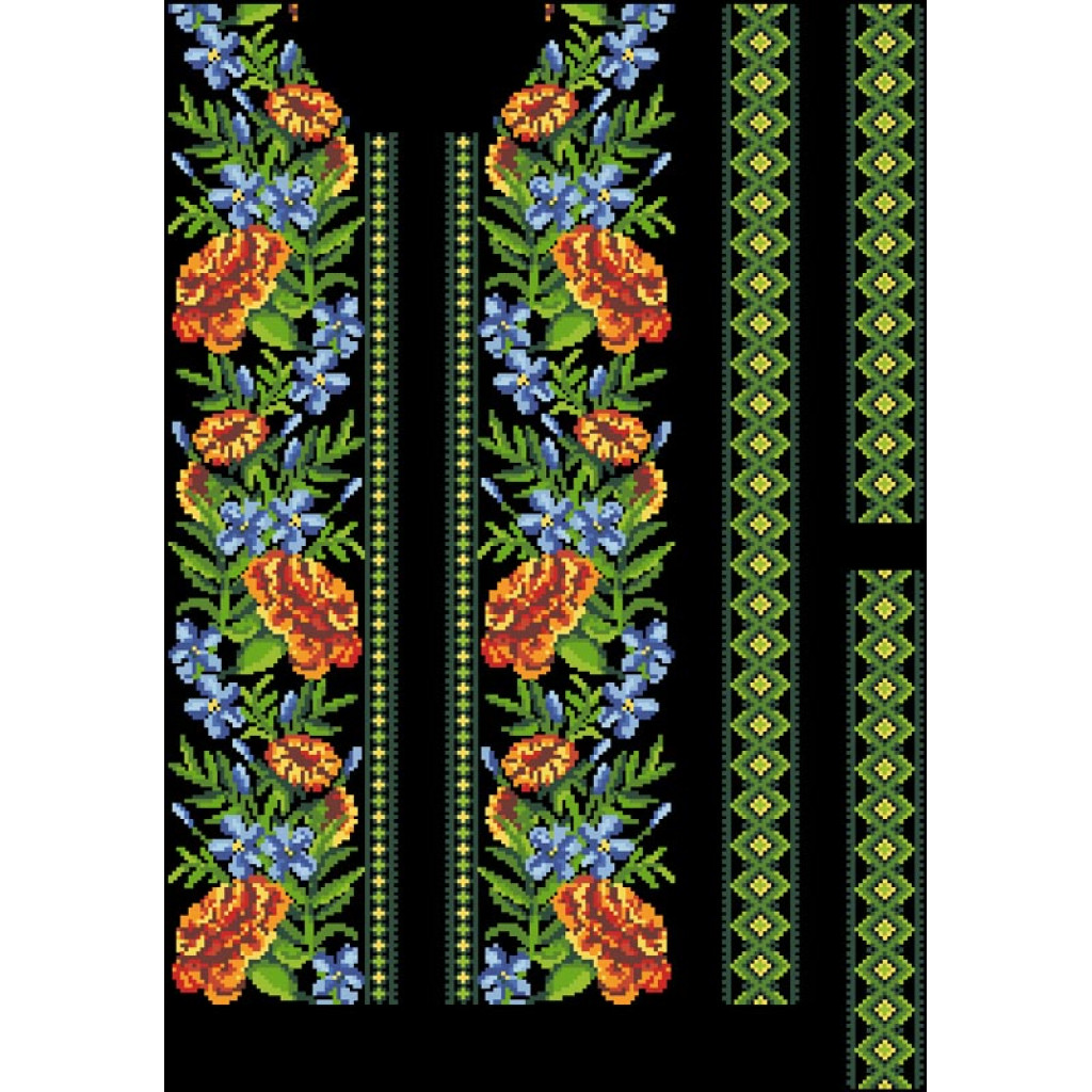 Заготовка для вишивки вставки до чоловічої сорочки Мамині чорнобривці розроблена для техніки часткової зашивки бісером або нитками. Схема надрукована на шовковому полотні чорного кольору екологічно чистими фарбами, які не зникають після прання. Тканина розкроєна прямокутниками з великим запасом, що забезпечує зручність у роботі та подальшому пошитті виробу.