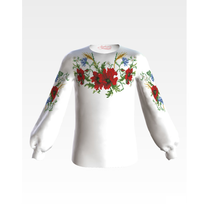 Заготовка для вишивки дитячої блузки Ніжні маки, волошки, колоски призначена для часткової зашивки бісером або нитками. Схема надрукована на білому шовку екологічно чистими фарбами, які не зникають після прання. Тканина розкроєна з урахуванням необхідного запасу для зручності у роботі та пошитті виробу.