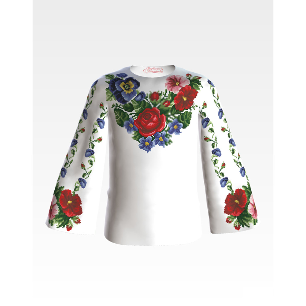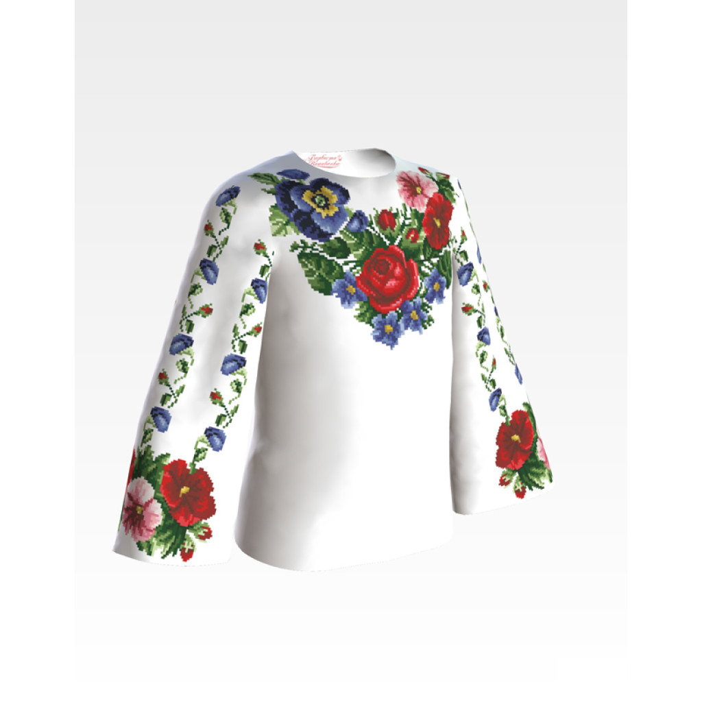 Заготовка для вишивки дитячої блузки Мальви, троянди, братки призначена для часткової зашивки бісером або нитками. Схема надрукована на габардині білого кольору екологічно чистими фарбами, які не зникають після прання. Тканина розкроєна з урахуванням необхідного запасу для зручності у роботі та пошитті виробу.