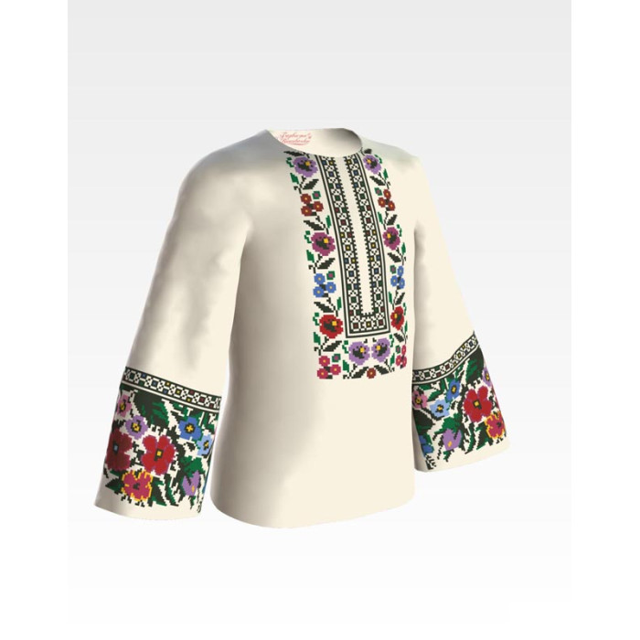 Заготовка для вишивки дитячої блузки Борщівська традиція призначена для часткової зашивки бісером або нитками. Схема надрукована на габардині бежевого кольору екологічно чистими фарбами, які не зникають після прання. Тканина розкроєна з урахуванням необхідного запасу для зручності у роботі та пошитті виробу.