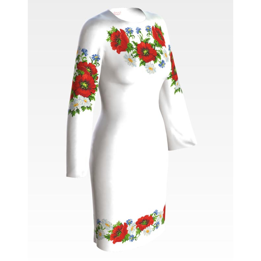 Заготовка для вишивки жіночої сукні Маки, ромашки, волошки призначена для часткової зашивки бісером або нитками. Схема надрукована на льоні білого кольору екологічно чистими стійкими фарбами, що не змиваються після прання. Відрізи розкроєні з урахуванням необхідних запасів для зручного вишивання та подальшого пошиття виробу.