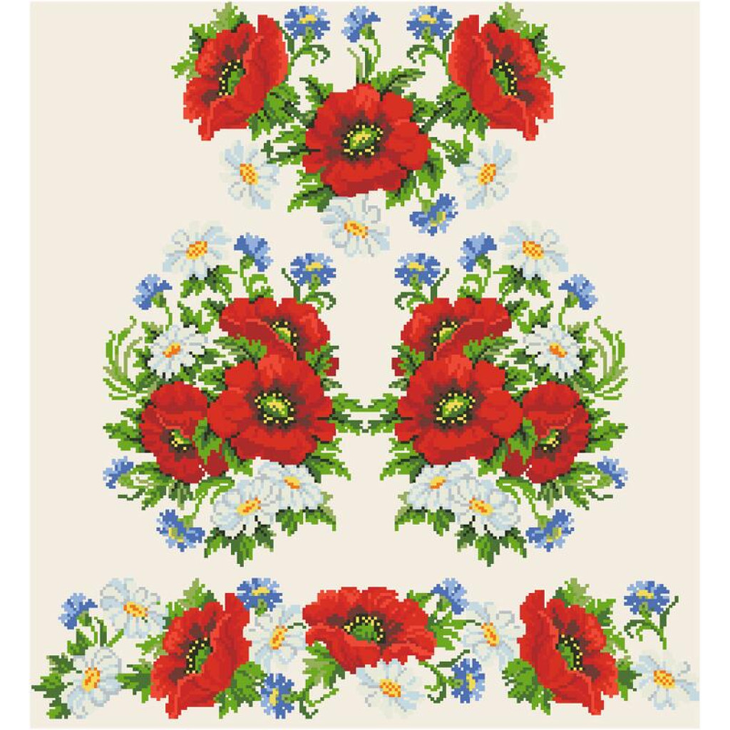 Заготовка для вишивки жіночої сукні Маки, ромашки, волошки призначена для часткової зашивки бісером або нитками. Схема надрукована на льоні бежевого кольору екологічно чистими стійкими фарбами, що не змиваються після прання. Відрізи розкроєні з урахуванням необхідних запасів для зручного вишивання та подальшого пошиття виробу.