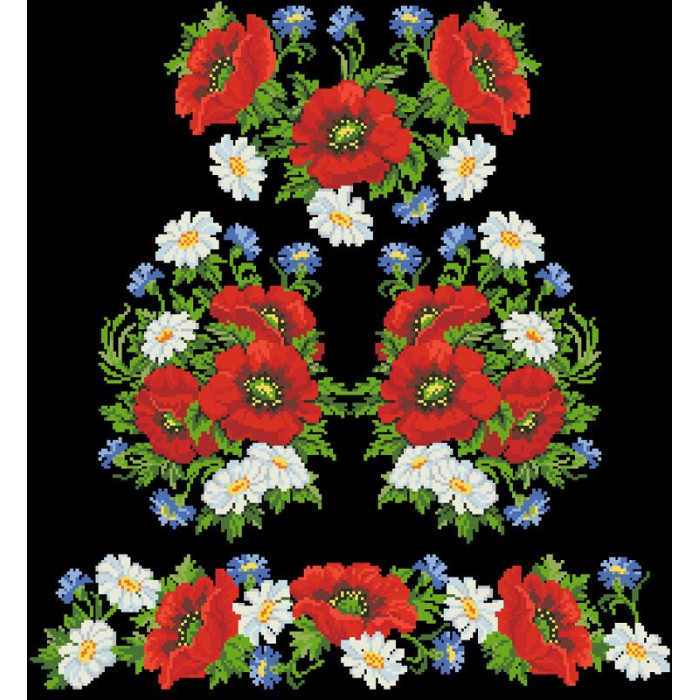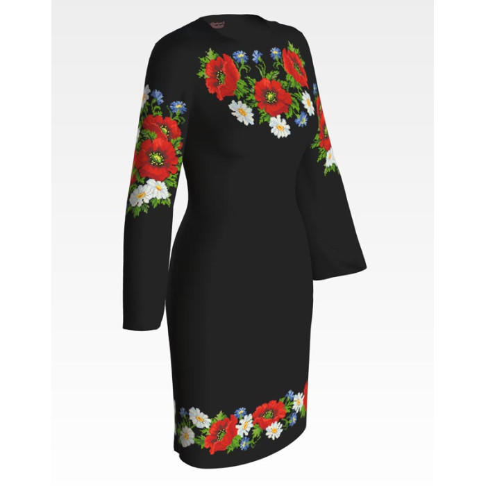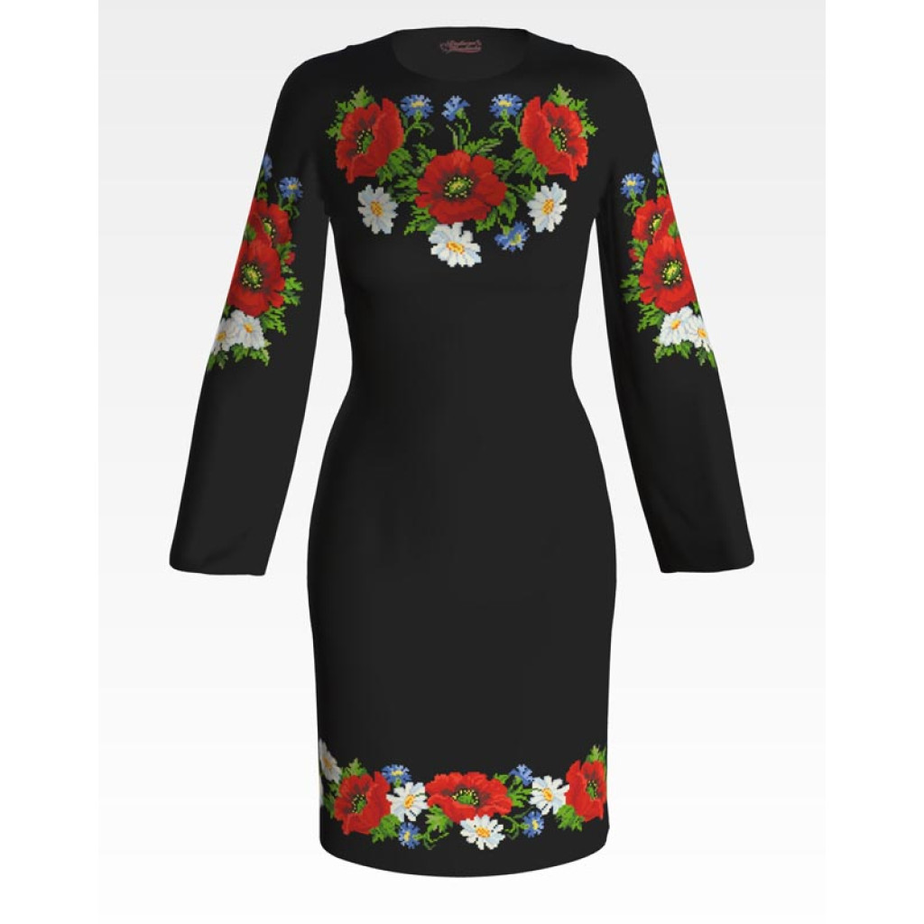 Заготовка для вишивки жіночої сукні Маки, ромашки, волошки призначена для часткової зашивки бісером або нитками. Схема надрукована на шовковій тканині чорного кольору екологічно чистими стійкими фарбами, що не змиваються після прання. Відрізи розкроєні з урахуванням запасів для зручного вишивання та подальшого пошиття виробу.