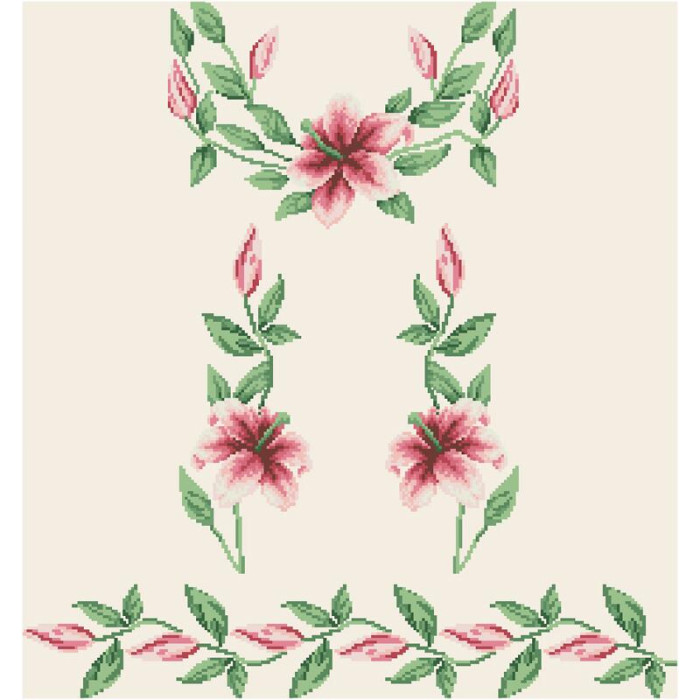 Заготовка для вишивки жіночої сукні Лілеї призначена для часткової зашивки бісером або нитками. Схема надрукована на домотканому полотні бежевого кольору екологічно чистими стійкими фарбами, що не змиваються після прання. Відрізи розкроєні з урахуванням необхідних запасів для зручного вишивання та подальшого пошиття виробу.