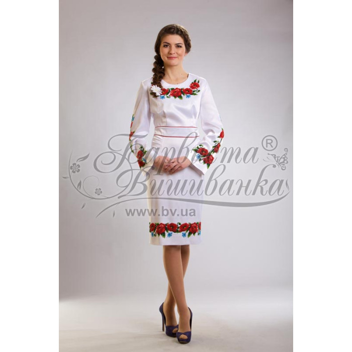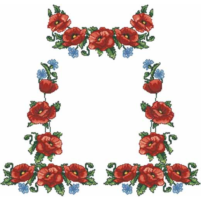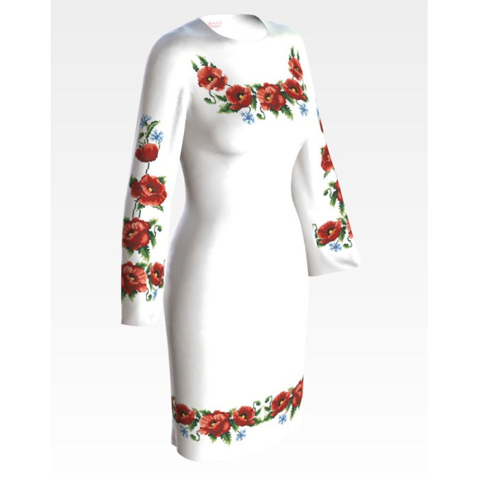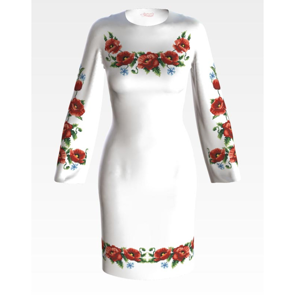 Заготовка для вишивки жіночої сукні Маки, волошки призначена для часткової зашивки бісером або нитками. Схема надрукована на білому габардині екологічно чистими стійкими фарбами, що не змиваються після прання. Відрізи розкроєні з урахуванням необхідних запасів для зручного вишивання та подальшого пошиття виробу.