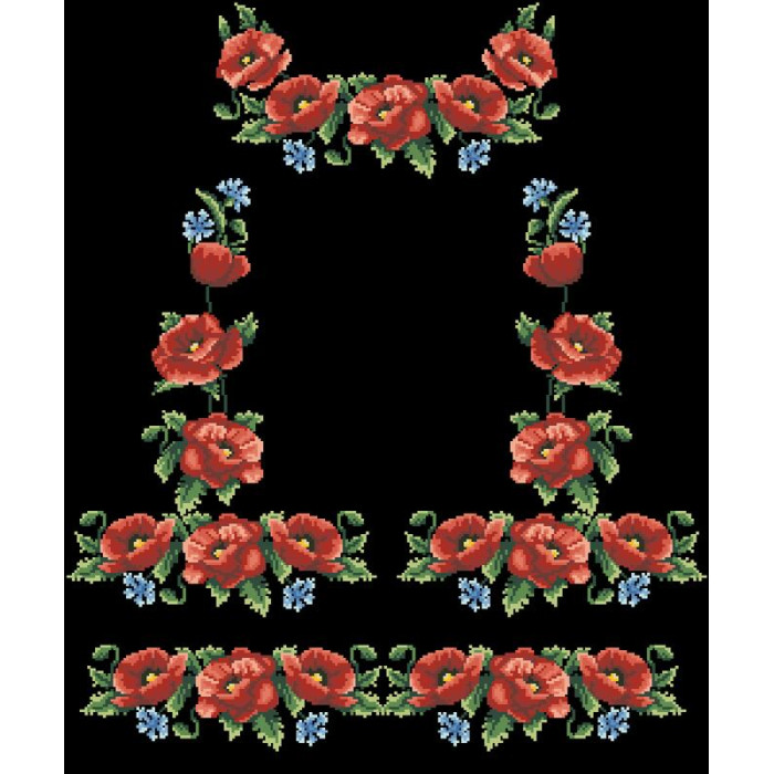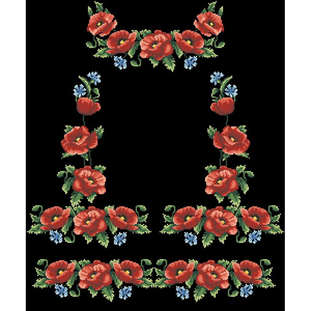 Заготовка для вишивки жіночої сукні Маки, волошки призначена для часткової зашивки бісером або нитками. Схема надрукована на шовковій тканині чорного кольору екологічно чистими стійкими фарбами, що не змиваються після прання. Відрізи розкроєні з урахуванням запасів для зручного вишивання та подальшого пошиття виробу.