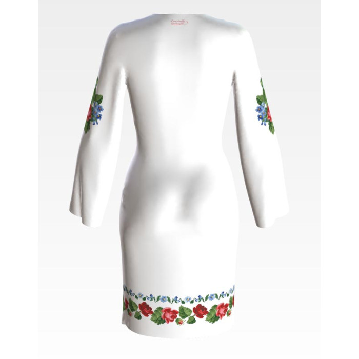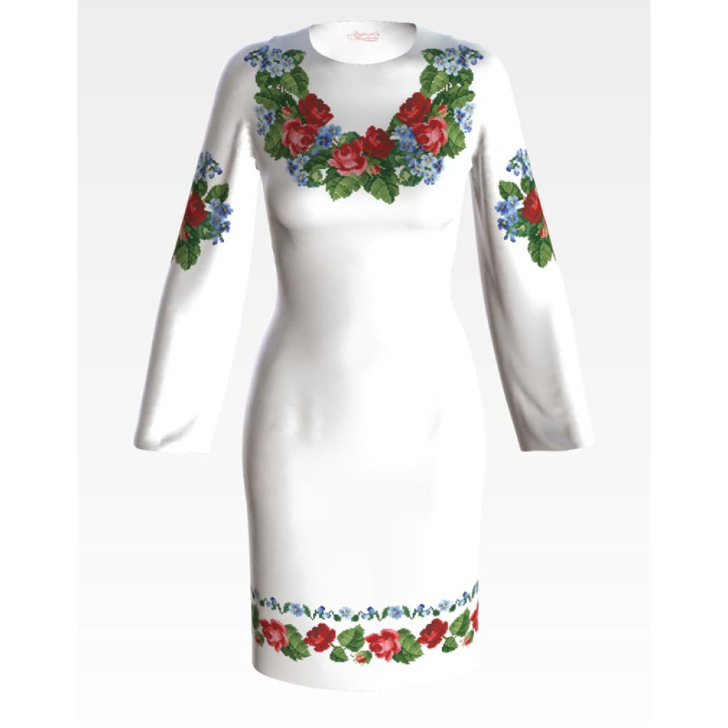 Заготовка для вишивки жіночої сукні Троянди і незабудки призначена для часткової зашивки бісером або нитками. Схема надрукована на білому габардині екологічно чистими стійкими фарбами, що не змиваються після прання. Відрізи розкроєні з урахуванням необхідних запасів для зручного вишивання та подальшого пошиття виробу.