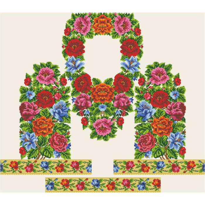Заготовка для вишивки жіночої сукні Багаті квіти. Буковинська призначена для часткової зашивки бісером або нитками. Схема надрукована на домотканому полотні бежевого кольору екологічно чистими стійкими фарбами, що не змиваються після прання. Відрізи розкроєні з урахуванням необхідних запасів для зручного вишивання та подальшого пошиття виробу.