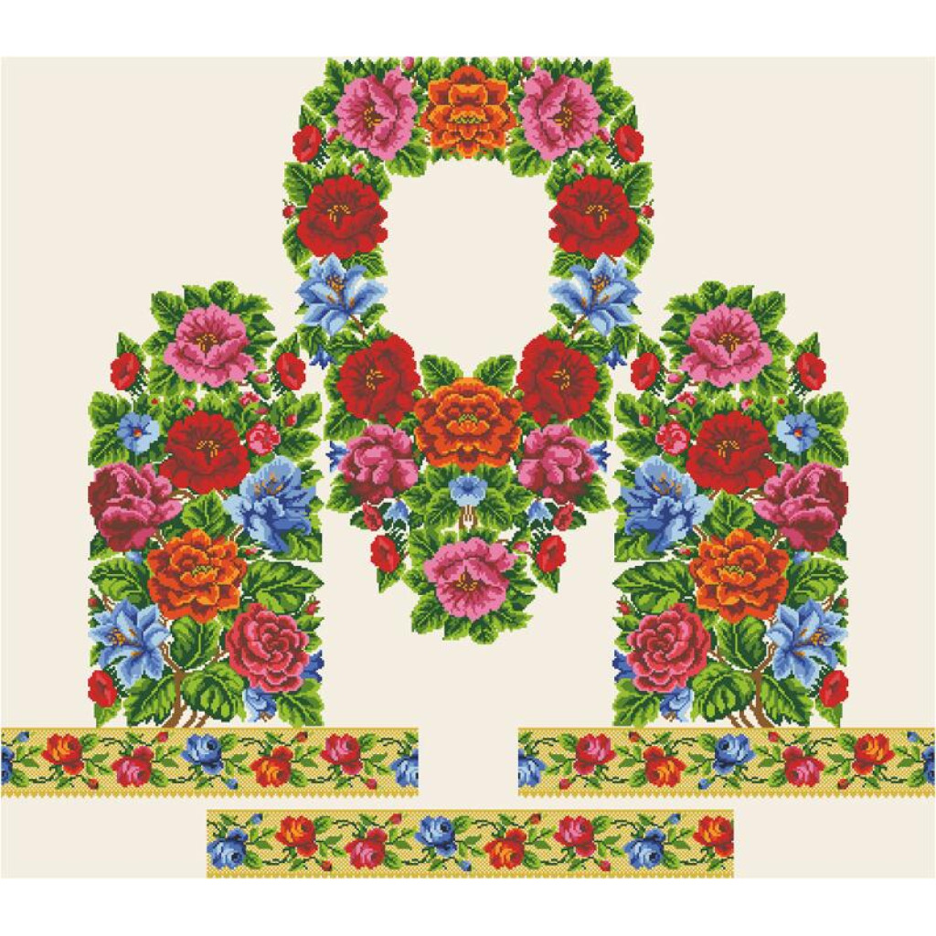 Заготовка для вишивки жіночої сукні Багаті квіти. Буковинська призначена для часткової зашивки бісером або нитками. Схема надрукована на атлас-котоні бежевого кольору екологічно чистими стійкими фарбами, що не змиваються після прання. Відрізи розкроєні з урахуванням необхідних запасів для зручного вишивання та подальшого пошиття виробу.