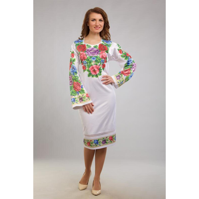 ПЛ006пБнннн Барвиста вишиванка Заготовка для вишивки - Сукня жіноча Розкішні квіти. Буковинська р.42-54 габардин, білий