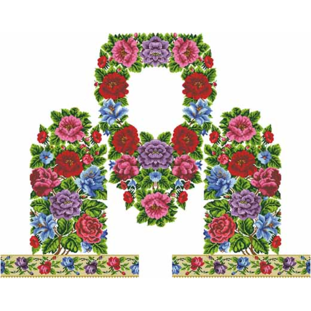 Заготовка для вишивки жіночої сукні Розкішні квіти. Буковинська призначена для часткової зашивки бісером або нитками. Схема надрукована на білому габардині екологічно чистими стійкими фарбами, що не змиваються після прання. Відрізи розкроєні з урахуванням необхідних запасів для зручного вишивання та подальшого пошиття виробу.