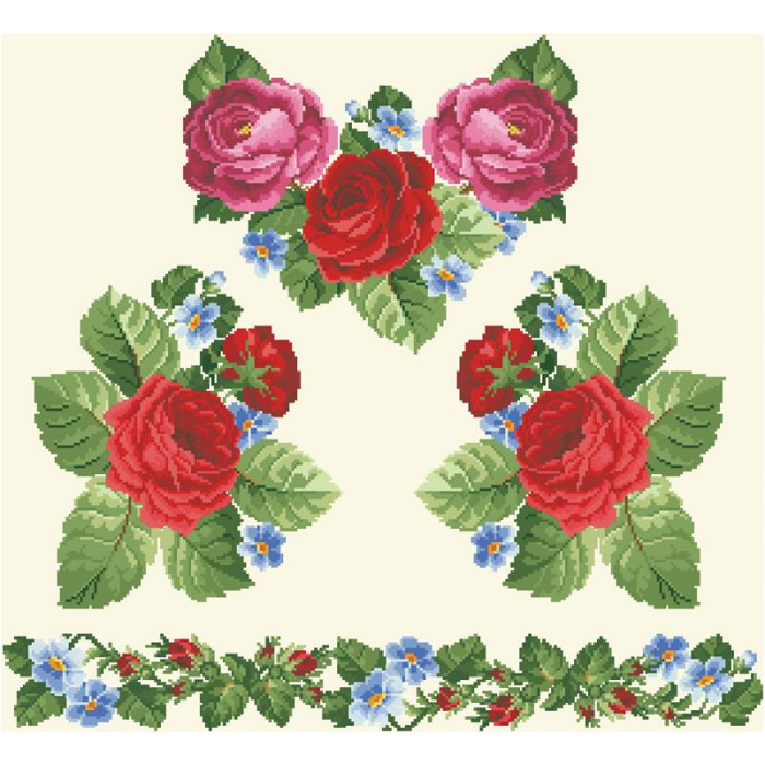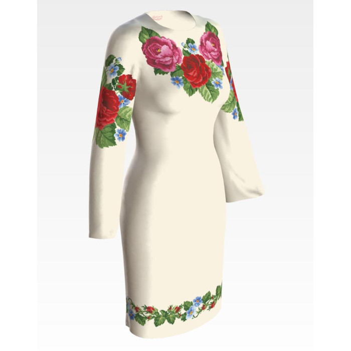Заготовка для вишивки жіночої сукні Пишні троянди, фіалки призначена для часткової зашивки бісером або нитками. Схема надрукована на атлас-котоні бежевого кольору екологічно чистими стійкими фарбами, що не змиваються після прання. Відрізи розкроєні з урахуванням необхідних запасів для зручного вишивання та подальшого пошиття виробу.