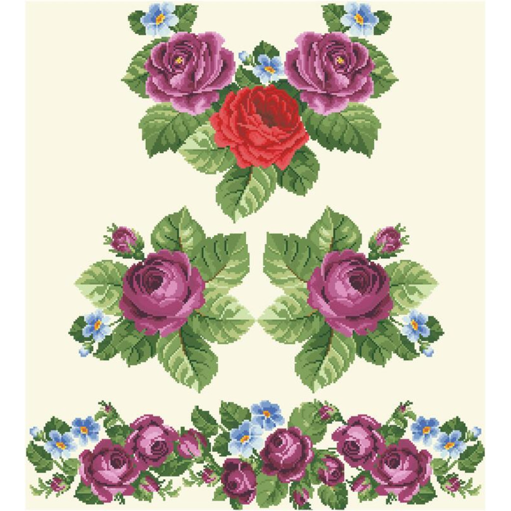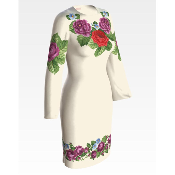 Заготовка для вишивки жіночої сукні Лілові троянди, фіалки призначена для часткової зашивки бісером або нитками. Схема надрукована на атлас-котоні бежевого кольору екологічно чистими стійкими фарбами, що не змиваються після прання. Відрізи розкроєні з урахуванням необхідних запасів для зручного вишивання та подальшого пошиття виробу.