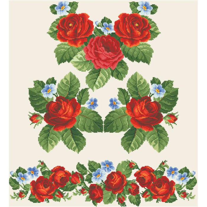 Заготовка для вишивки жіночої сукні Пристрасні троянди, фіалки призначена для часткової зашивки бісером або нитками. Схема надрукована на домотканому полотні бежевого кольору екологічно чистими стійкими фарбами, що не змиваються після прання. Відрізи розкроєні з урахуванням необхідних запасів для зручного вишивання та подальшого пошиття виробу.