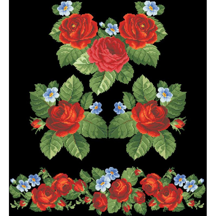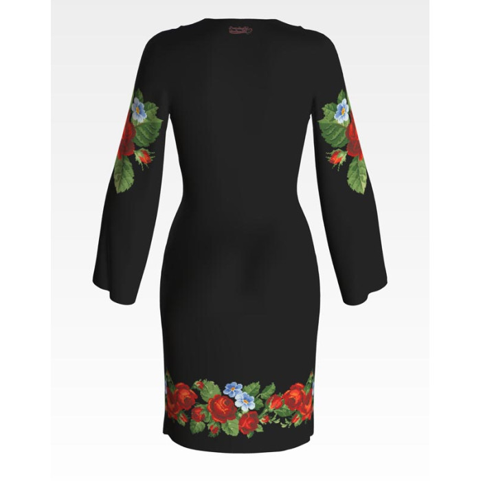 Заготовка для вишивки жіночої сукні Пристрасні троянди, фіалки призначена для часткової зашивки бісером або нитками. Схема надрукована на атлас-котоні чорного кольору екологічно чистими стійкими фарбами, що не змиваються після прання. Відрізи розкроєні з урахуванням необхідних запасів для зручного вишивання та подальшого пошиття виробу.