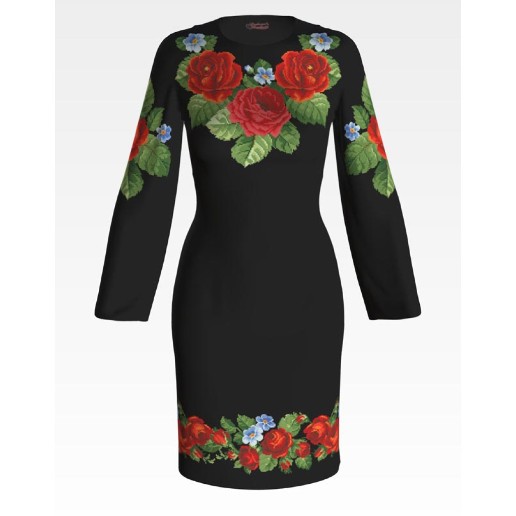 Заготовка для вишивки жіночої сукні Пристрасні троянди, фіалки призначена для часткової зашивки бісером або нитками. Схема надрукована на льоні чорного кольору екологічно чистими стійкими фарбами, що не змиваються після прання. Відрізи розкроєні з урахуванням необхідних запасів для зручного вишивання та подальшого пошиття виробу.