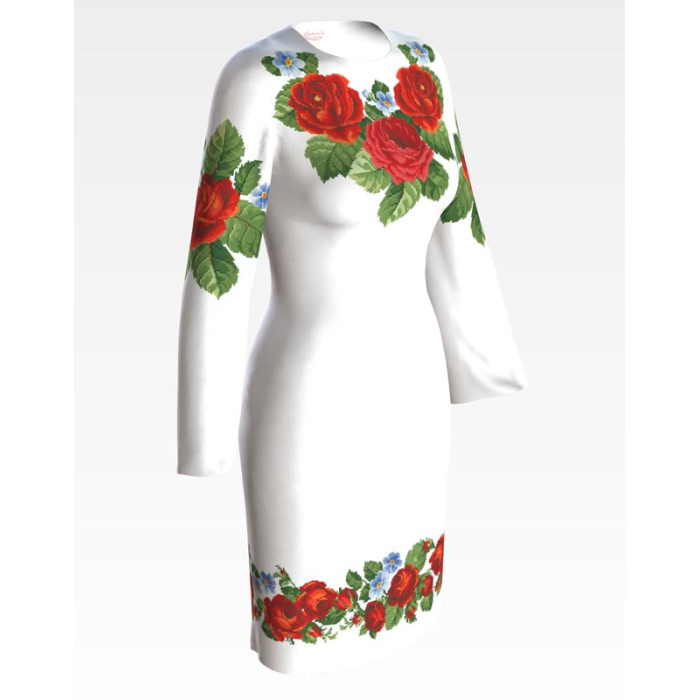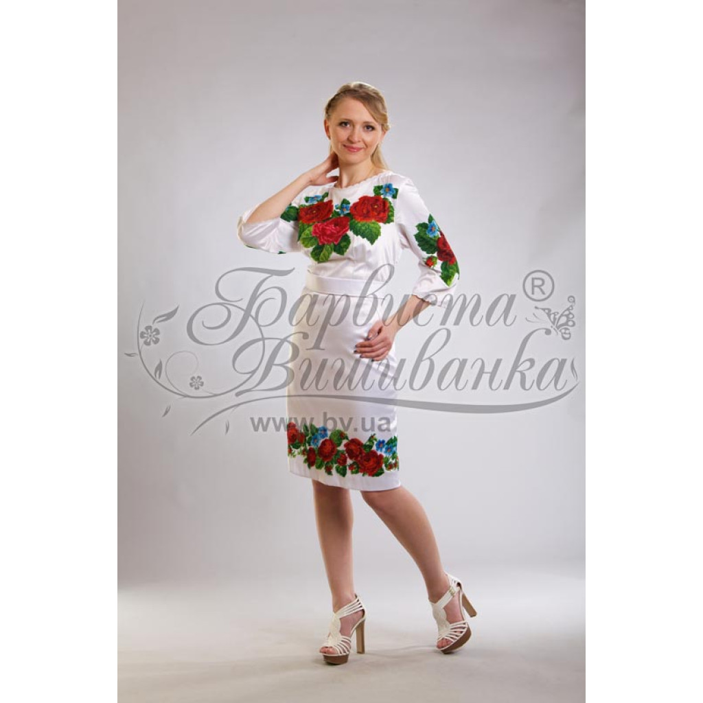 Заготовка для вишивки жіночої сукні Пристрасні троянди, фіалки призначена для часткової зашивки бісером або нитками. Схема надрукована на білому габардині екологічно чистими стійкими фарбами, що не змиваються після прання. Відрізи розкроєні з урахуванням необхідних запасів для зручного вишивання та подальшого пошиття виробу.