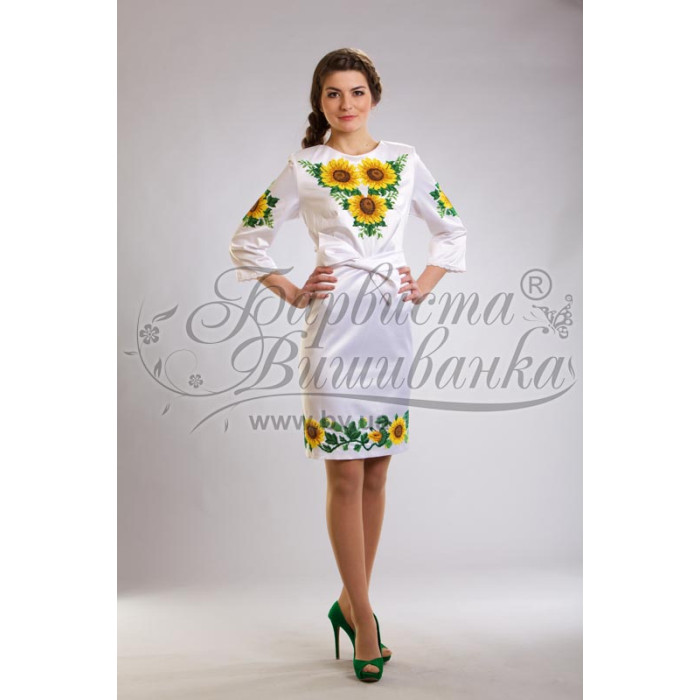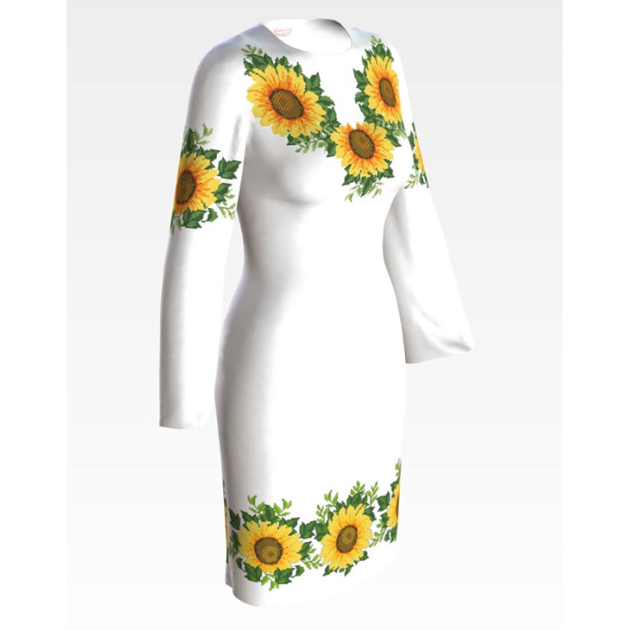 Заготовка для вишивки жіночої сукні Соняхи призначена для часткової зашивки бісером або нитками. Схема надрукована на білому габардині екологічно чистими стійкими фарбами, що не змиваються після прання. Відрізи розкроєні з урахуванням необхідних запасів для зручного вишивання та подальшого пошиття виробу.