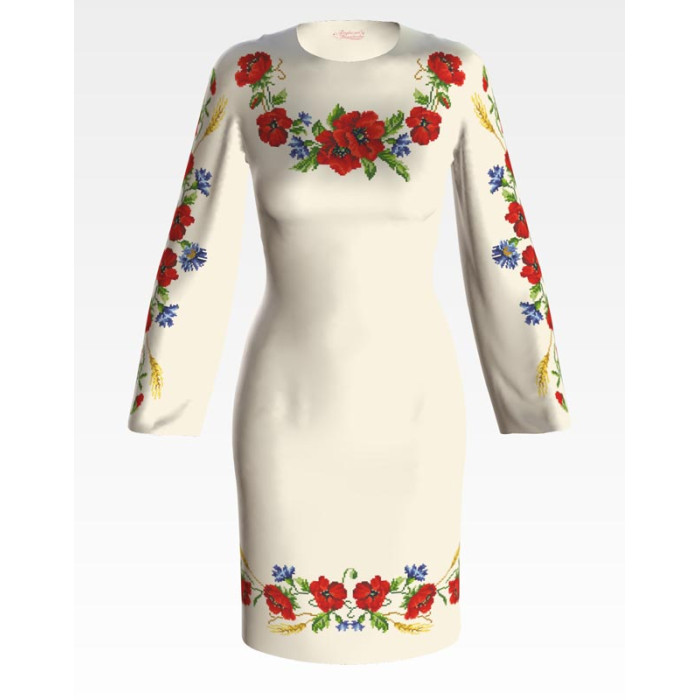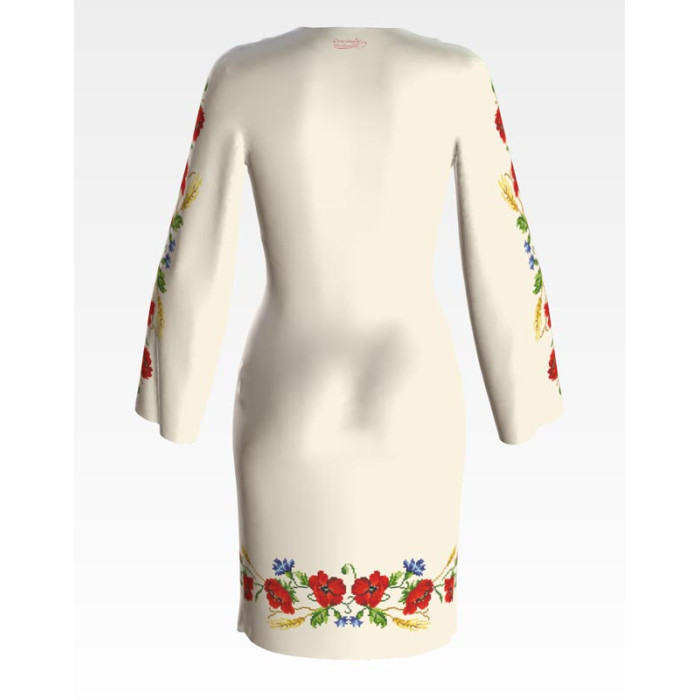 Заготовка для вишивки жіночої сукні Маки, волошки, колоски призначена для часткової зашивки бісером або нитками. Схема надрукована на атлас-котоні бежевого кольору екологічно чистими стійкими фарбами, що не змиваються після прання. Відрізи розкроєні з урахуванням необхідних запасів для зручного вишивання та подальшого пошиття виробу.