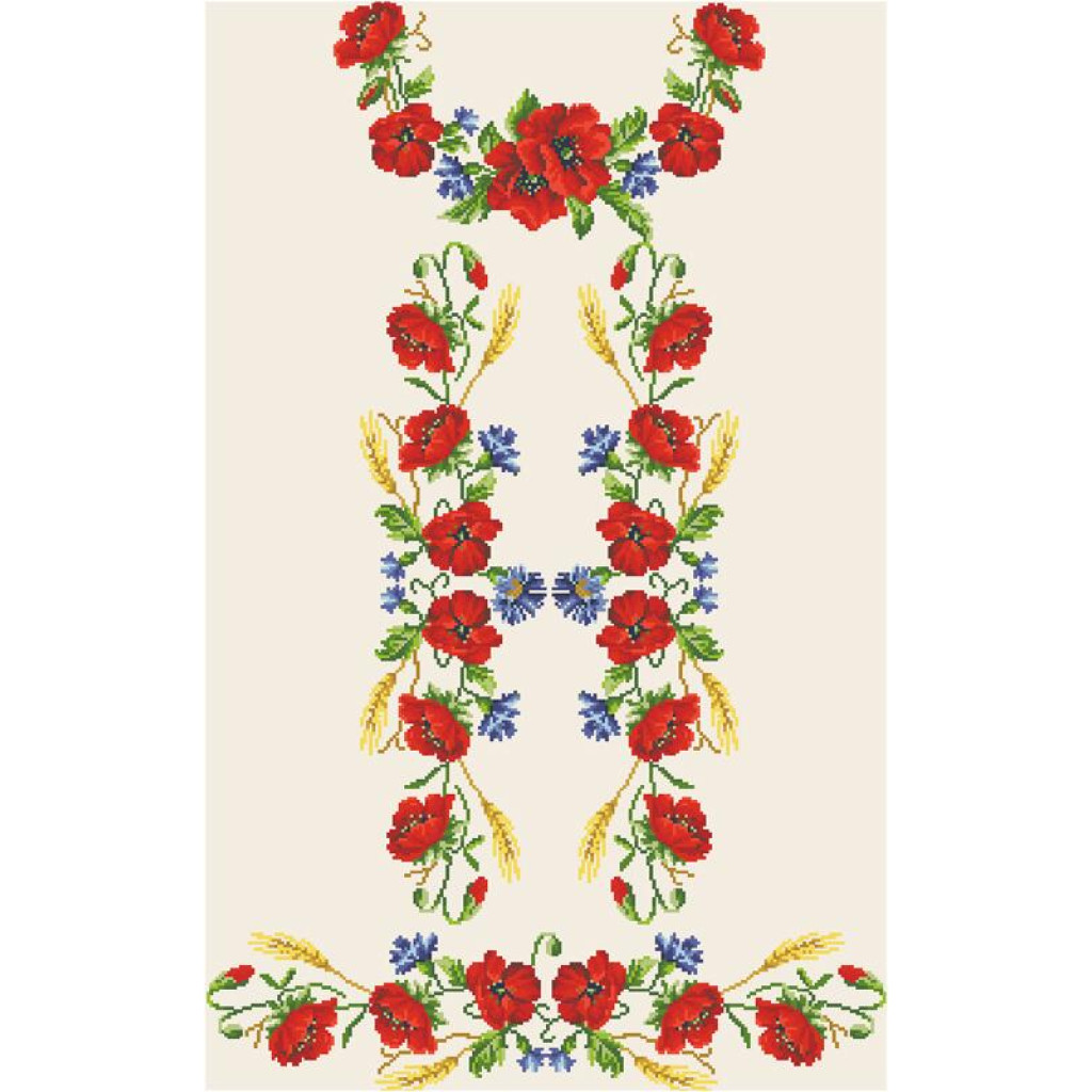 Заготовка для вишивки жіночої сукні Маки, волошки, колоски призначена для часткової зашивки бісером або нитками. Схема надрукована на льоні бежевого кольору екологічно чистими стійкими фарбами, що не змиваються після прання. Відрізи розкроєні з урахуванням необхідних запасів для зручного вишивання та подальшого пошиття виробу.