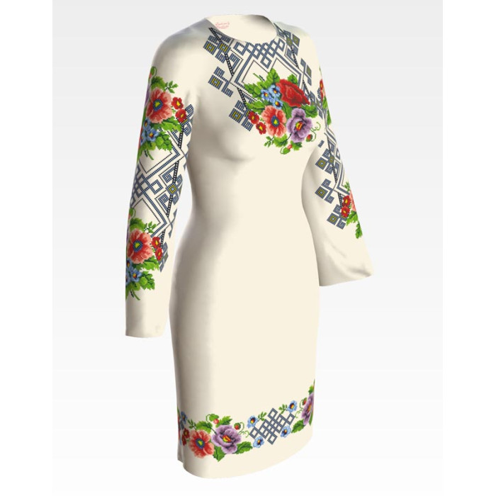 Заготовка для вишивки жіночої сукні Маки і незабудки. Молодіжна призначена для часткової зашивки бісером або нитками. Схема надрукована на домотканому полотні бежевого кольору екологічно чистими стійкими фарбами, що не змиваються після прання. Відрізи розкроєні з урахуванням необхідних запасів для зручного вишивання та подальшого пошиття виробу.