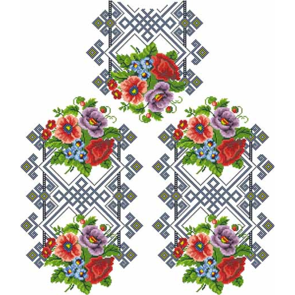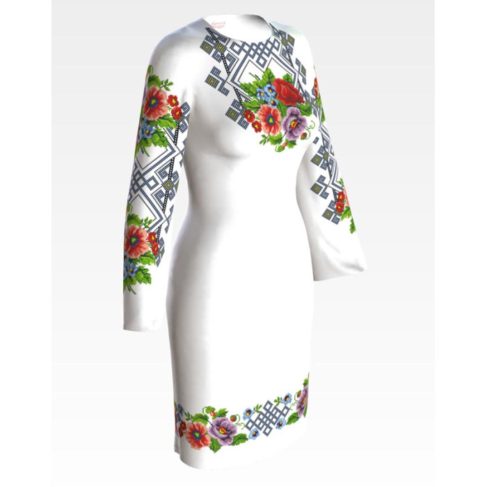 Заготовка для вишивки жіночої сукні Маки і незабудки. Молодіжна призначена для часткової зашивки бісером або нитками. Схема надрукована на льоні білого кольору екологічно чистими стійкими фарбами, що не змиваються після прання. Відрізи розкроєні з урахуванням необхідних запасів для зручного вишивання та подальшого пошиття виробу.