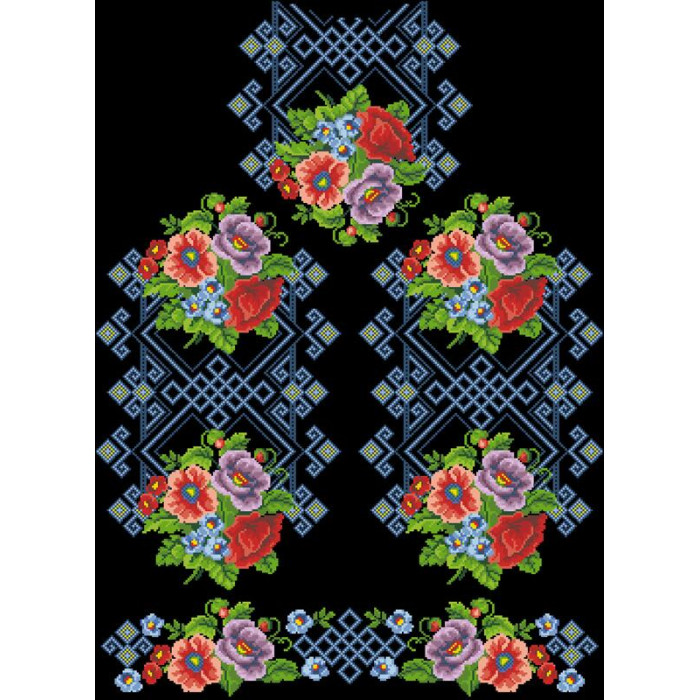 Заготовка для вишивки жіночої сукні Маки і незабудки. Молодіжна призначена для часткової зашивки бісером або нитками. Схема надрукована на льоні чорного кольору екологічно чистими стійкими фарбами, що не змиваються після прання. Відрізи розкроєні з урахуванням необхідних запасів для зручного вишивання та подальшого пошиття виробу.