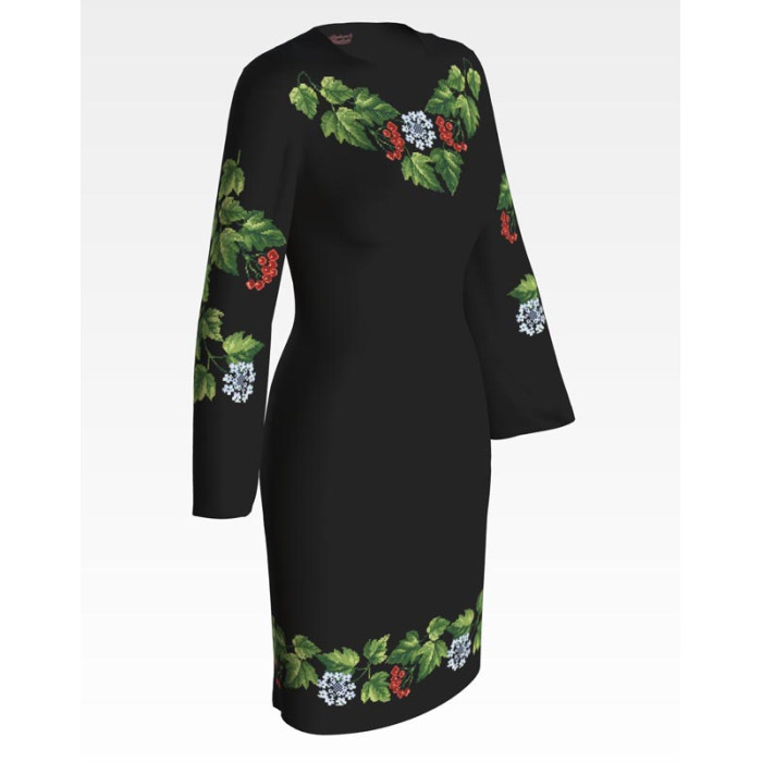 Заготовка для вишивки жіночої сукні Цвіт калини призначена для часткової зашивки бісером або нитками. Схема надрукована на льоні чорного кольору екологічно чистими стійкими фарбами, що не змиваються після прання. Відрізи розкроєні з урахуванням необхідних запасів для зручного вишивання та подальшого пошиття виробу.