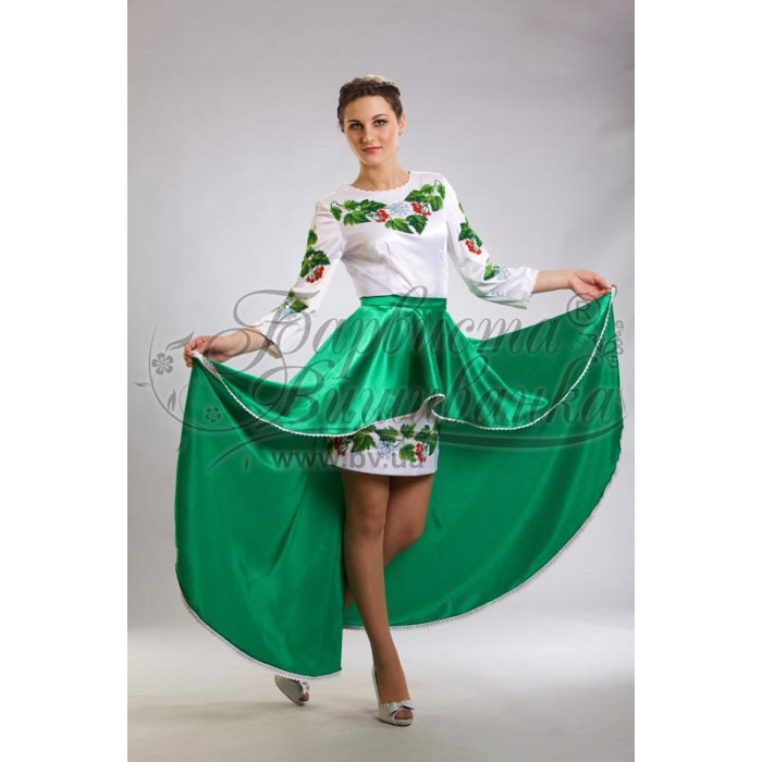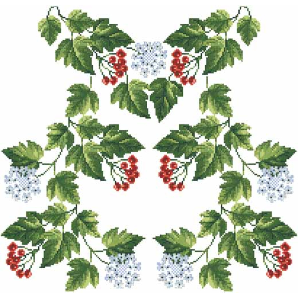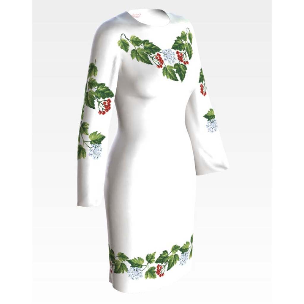 Заготовка для вишивки жіночої сукні Цвіт калини призначена для часткової зашивки бісером або нитками. Схема надрукована на білому габардині екологічно чистими стійкими фарбами, що не змиваються після прання. Відрізи розкроєні з урахуванням необхідних запасів для зручного вишивання та подальшого пошиття виробу.