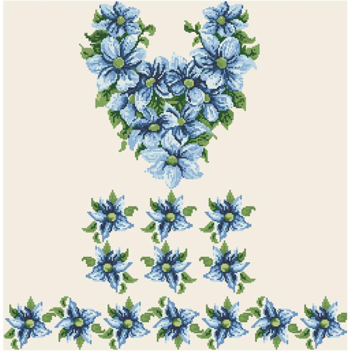 Заготовка для вишивки жіночої сукні Сині квіти призначена для часткової зашивки бісером або нитками. Схема надрукована на домотканому полотні бежевого кольору екологічно чистими стійкими фарбами, що не змиваються після прання. Відрізи розкроєні з урахуванням необхідних запасів для зручного вишивання та подальшого пошиття виробу.