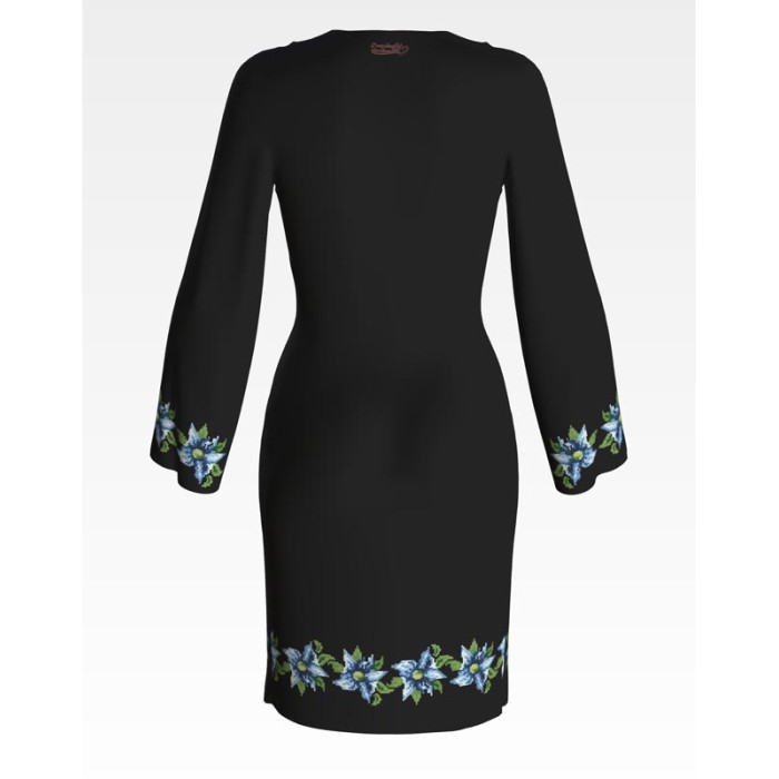 Заготовка для вишивки жіночої сукні Сині квіти призначена для часткової зашивки бісером або нитками. Схема надрукована на шовковій тканині чорного кольору екологічно чистими стійкими фарбами, що не змиваються після прання. Відрізи розкроєні з урахуванням запасів для зручного вишивання та подальшого пошиття виробу.