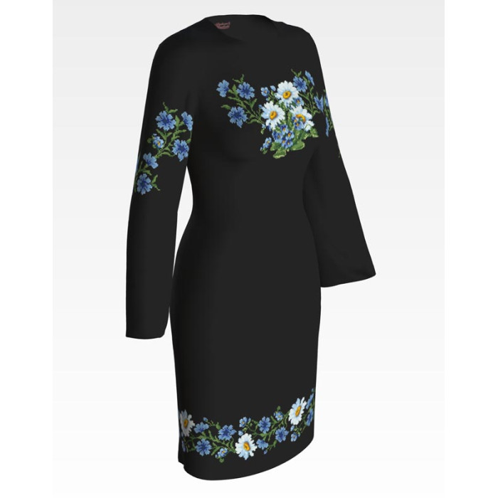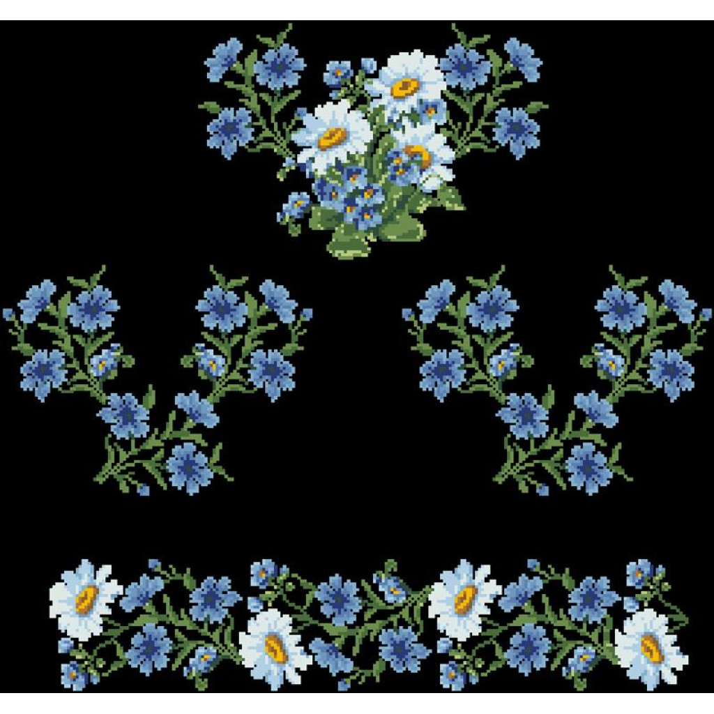 Заготовка для вишивки жіночої сукні Ромашки і волошки призначена для часткової зашивки бісером або нитками. Схема надрукована на льоні чорного кольору екологічно чистими стійкими фарбами, що не змиваються після прання. Відрізи розкроєні з урахуванням необхідних запасів для зручного вишивання та подальшого пошиття виробу.