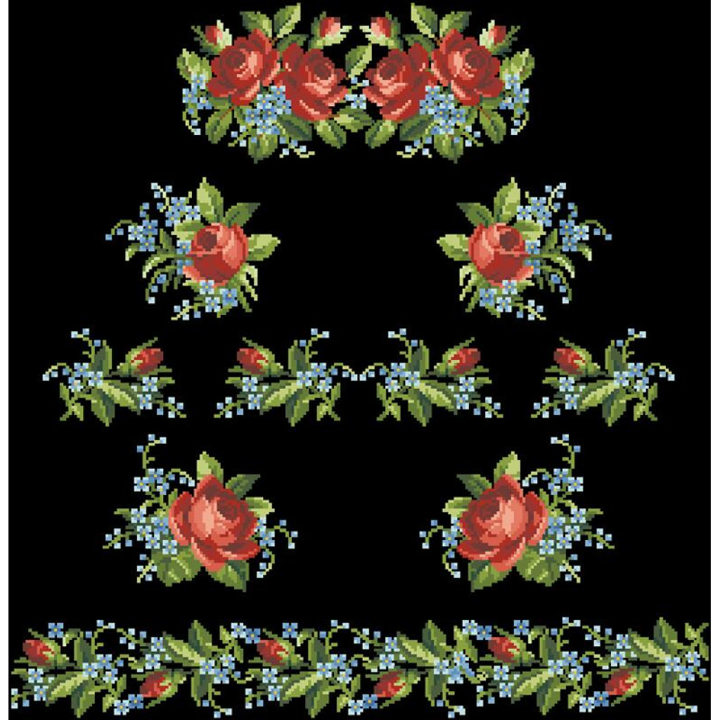 Заготовка для вишивки жіночої сукні Вишукані троянди, незабудки призначена для часткової зашивки бісером або нитками. Схема надрукована на домотканому полотні чорного кольору екологічно чистими стійкими фарбами, що не змиваються після прання. Відрізи розкроєні з урахуванням необхідних запасів для зручного вишивання та подальшого пошиття виробу.