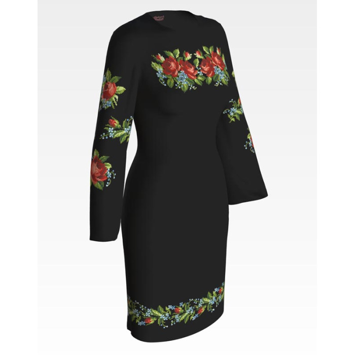 Заготовка для вишивки жіночої сукні Вишукані троянди, незабудки призначена для часткової зашивки бісером або нитками. Схема надрукована на атлас-котоні чорного кольору екологічно чистими стійкими фарбами, що не змиваються після прання. Відрізи розкроєні з урахуванням необхідних запасів для зручного вишивання та подальшого пошиття виробу.