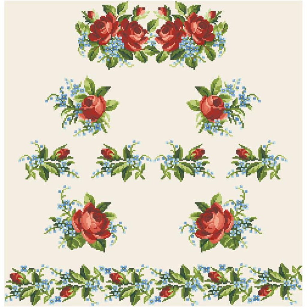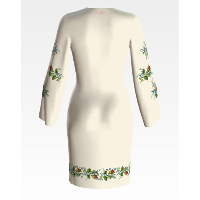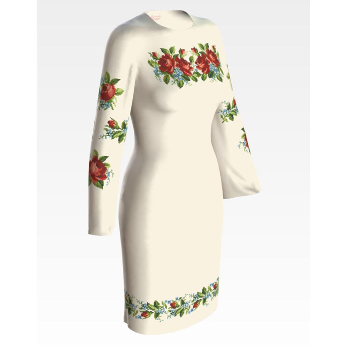 Заготовка для вишивки жіночої сукні Вишукані троянди, незабудки призначена для часткової зашивки бісером або нитками. Схема надрукована на атлас-котоні бежевого кольору екологічно чистими стійкими фарбами, що не змиваються після прання. Відрізи розкроєні з урахуванням необхідних запасів для зручного вишивання та подальшого пошиття виробу.