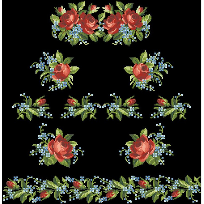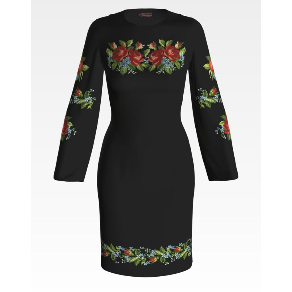 Заготовка для вишивки жіночої сукні Вишукані троянди, незабудки призначена для часткової зашивки бісером або нитками. Схема надрукована на льоні чорного кольору екологічно чистими стійкими фарбами, що не змиваються після прання. Відрізи розкроєні з урахуванням необхідних запасів для зручного вишивання та подальшого пошиття виробу.