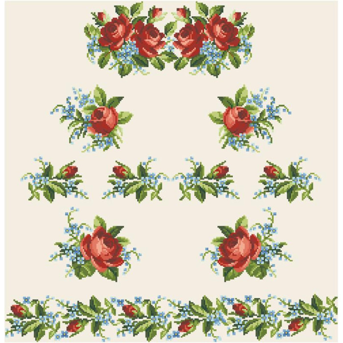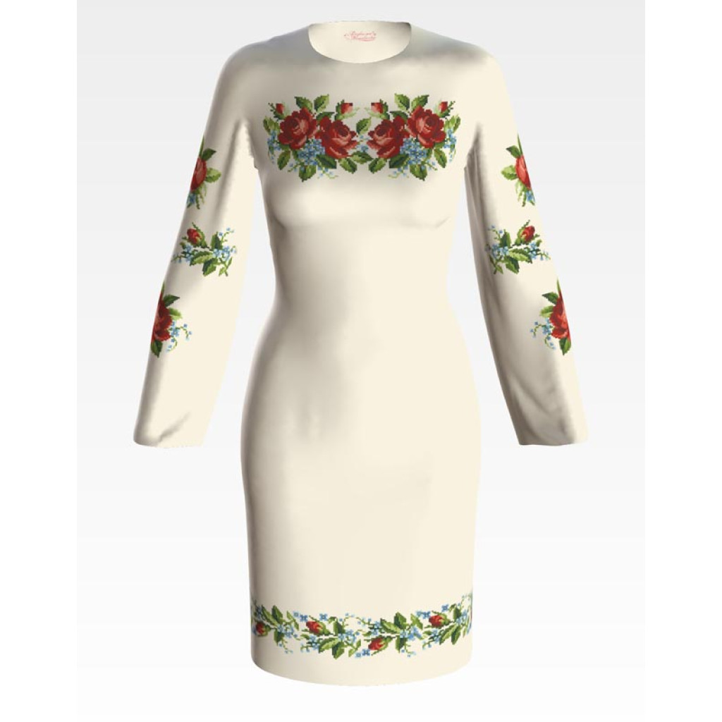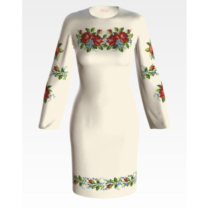 Заготовка для вишивки жіночої сукні Вишукані троянди, незабудки призначена для часткової зашивки бісером або нитками. Схема надрукована на льоні бежевого кольору екологічно чистими стійкими фарбами, що не змиваються після прання. Відрізи розкроєні з урахуванням необхідних запасів для зручного вишивання та подальшого пошиття виробу.