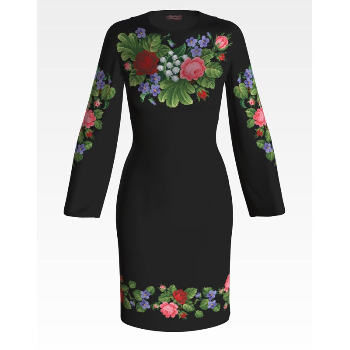 Заготовка для вишивки жіночої сукні Троянди, фіалки, конвалії призначена для часткової зашивки бісером або нитками. Схема надрукована на домотканому полотні чорного кольору екологічно чистими стійкими фарбами, що не змиваються після прання. Відрізи розкроєні з урахуванням необхідних запасів для зручного вишивання та подальшого пошиття виробу.