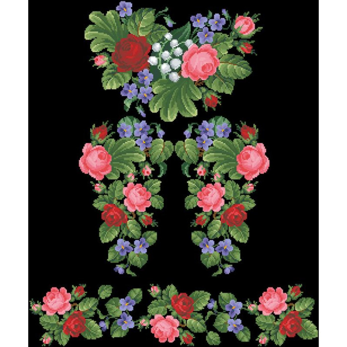 Заготовка для вишивки жіночої сукні Троянди, фіалки, конвалії призначена для часткової зашивки бісером або нитками. Схема надрукована на атлас-котоні чорного кольору екологічно чистими стійкими фарбами, що не змиваються після прання. Відрізи розкроєні з урахуванням необхідних запасів для зручного вишивання та подальшого пошиття виробу.